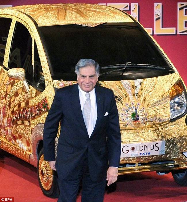 Flashy motor: Today Tata unveiled its 'Nano' car crafted in gold, silver and gem stones in Mumbai, India, and below the amount of precious metals and stones used in the one-off design is shown clearly side on. Billionaire businessman Ratan Tata - who recently bought Jaguar Land Rover to add to his collection of car companies - ordered the one-off design to celebrate the strength of his country's growing wealth and mark its history. Paying homage to 5,000 years of jewellery tradition in India, Tata Motors said it had created the world's first 'jewellery car'. Unveiling: Ratan Tata, chairman of Tata Group, standing next to the car which he says celebrates 5,000 years of jewellery making in India. Fascinated: People stare at the Goldplus car covered in 80kg of 22 carat gold, 15kg of silver and 10,000 semi precious stones and gems. Aimed at emerging middle class, the original Nano that launched with a 100,000-long customer waiting list in 2008 has seen sales plummet.
